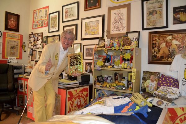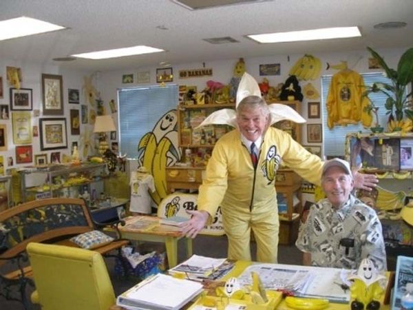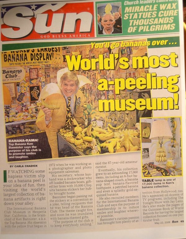 The VERY FIRST Banana Museum was located at a store front in Altadena, CA and was opened in 1976 by Ken Bannister, T.B. We accumulated more than 17,000 tasteful banana related items and were located here THIRTY FIVE YEARS! ... We moved the museum to Hesperia, CA in 2005 and the city provided a no charge facility at the Harrison Center on Main Street thanks to the Recreation and Parks Department. WORLDWIDE MEDIA HAS FEATURED THIS CLUB AND COLLECTION FOR OVER 45 YEARS! WE SET THE GUINNESS WORLD RECORD FOR "THE MOST ITEMS DEVOTED TO ANY ONE FRUIT"! Documented in the Guinness Golden Anniversary Book back in 2005. GUINNESS again documented in 2018 with "Marla the Amazing" See the VIDEO. There are multiple YOUTUBE videos on Ken and the Club.